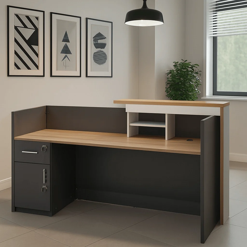Built from engineered wood, MDF, or laminated panels, the desk is designed for durability in high-traffic areas. Its scratch-resistant surfaces and sturdy structure ensure long-term performance, even with daily use. As a result, it maintains a clean and professional appearance over time.